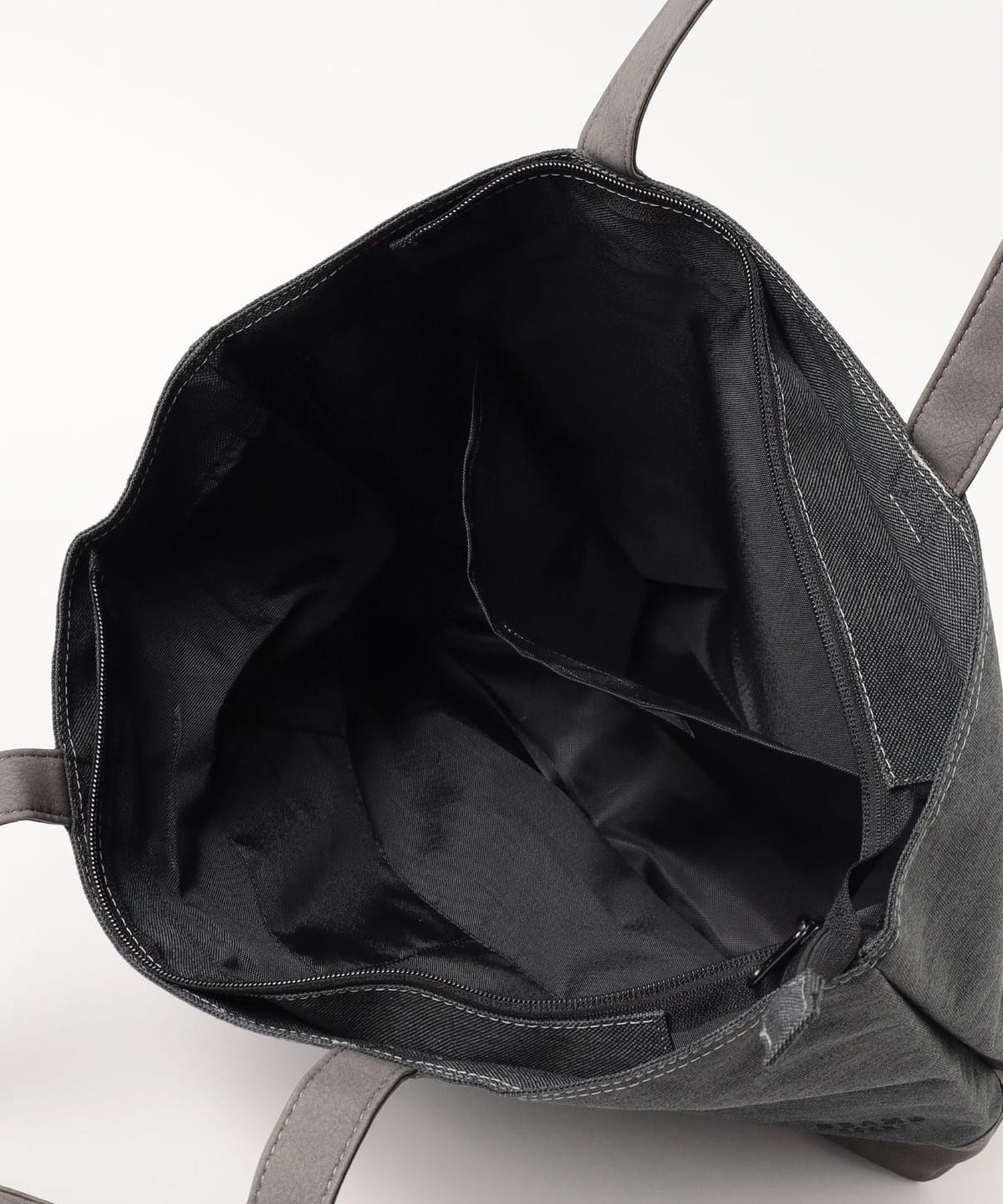 手提袋採用混色聚酯面料,飾有精緻的刺繡logo和仿皮點綴。